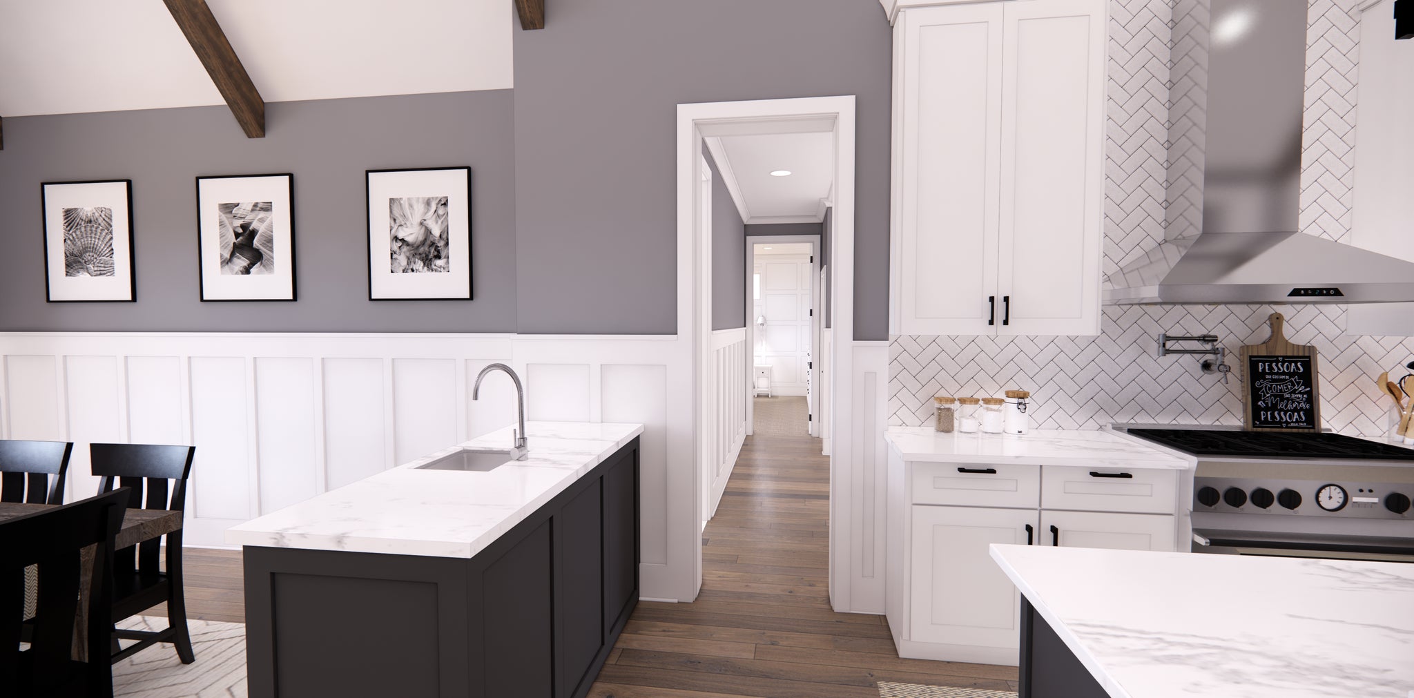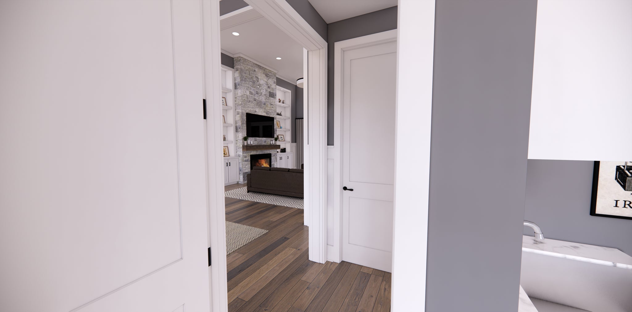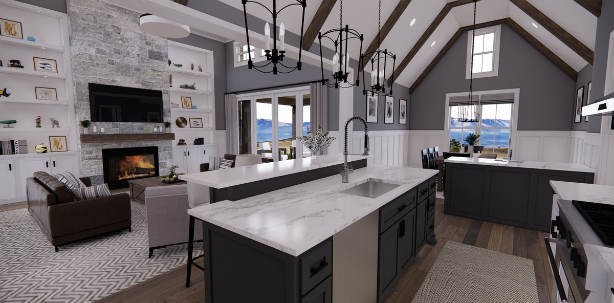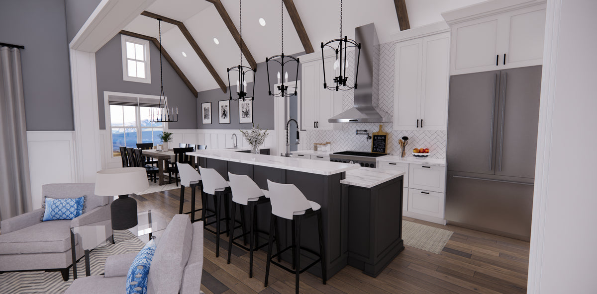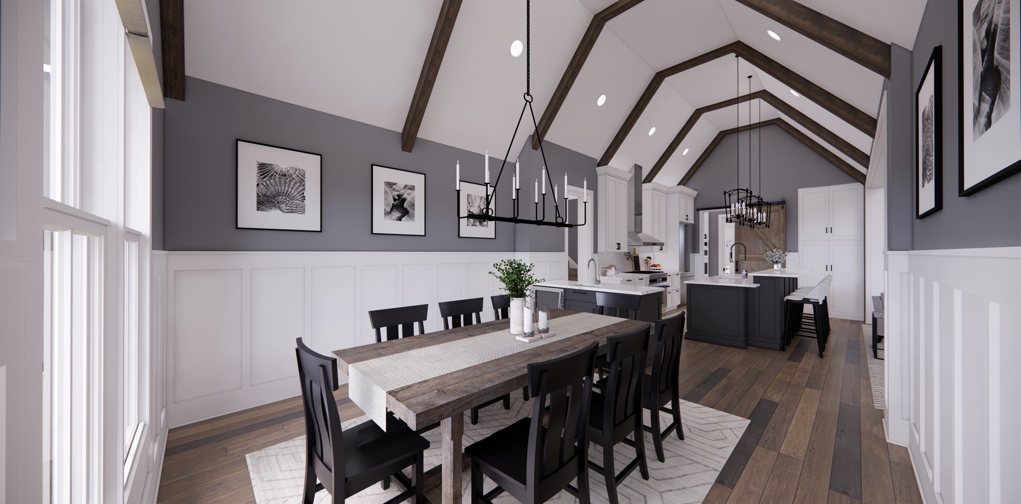 With striking wood and stone accents, this 2,358 sq ft Craftsman home delivers timeless beauty and family-friendly function all in one. Inside, a wide-open layout connects the great room, kitchen, and dining room beneath vaulted ceilings, creating an ideal space for gathering and entertaining. The great room features a cozy fireplace with built-ins and a 12’ folding door opening to the expansive covered rear porch. The kitchen includes a large island with seating for four, a walk-in pantry with sliding barn doors, and a convenient wet bar—perfect for everything from morning coffee to evening cocktails.