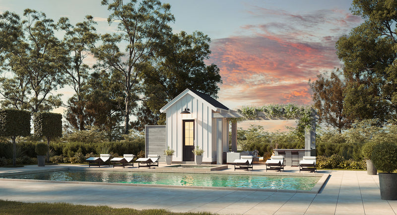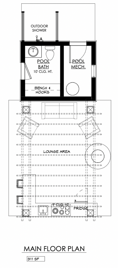With a width of 27 feet and a depth of 11'6'', the building stands 14'6'' tall, and the first-floor ceiling height is an impressive 10 feet. This design provides a perfect, compact retreat near your pool area, maximizing space while maintaining a stylish, practical layout.