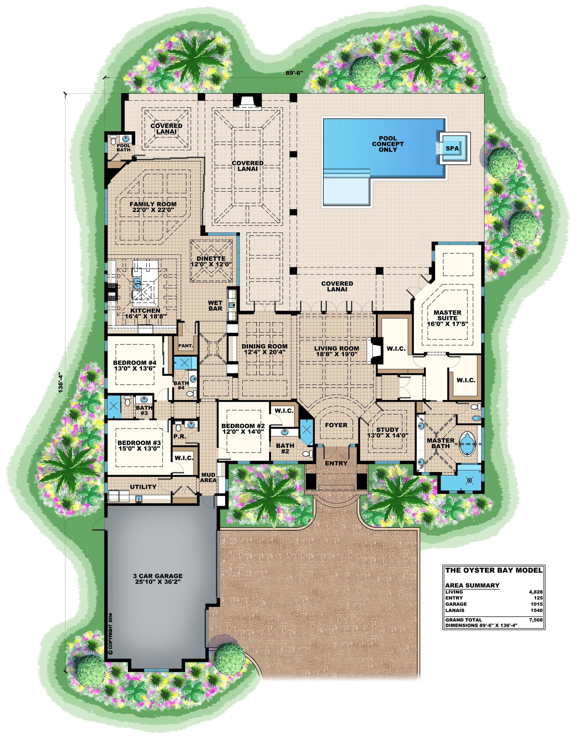 The family room is combined with the dinette and large island kitchen, but each space has unique ceiling designs. There is also a nearby wet bar. The master suite has a large sitting area with picture windows maximizing rear views. Two walk-in closets and an opulent master bath make for a luxurious owner's retreat. The home plan also has three guest bedrooms, three full baths, a powder room, pool bath, mudroom, utility room and a three-car garage.