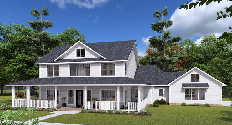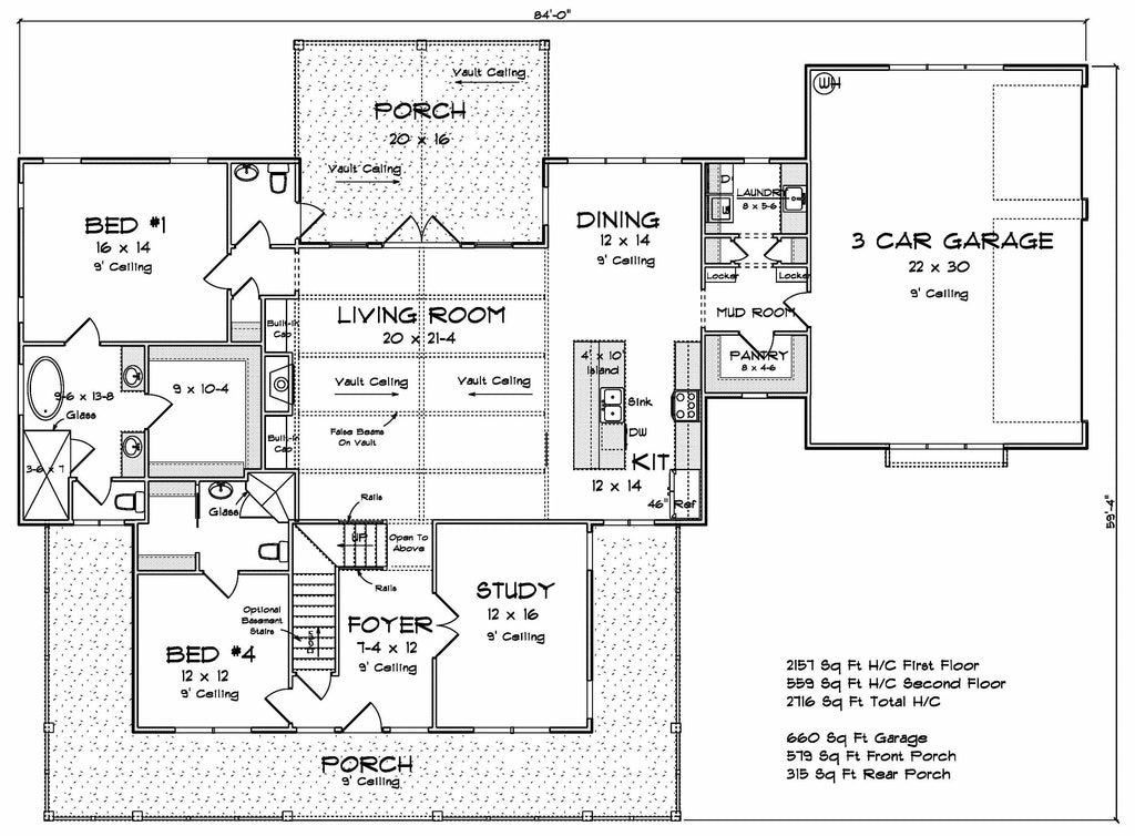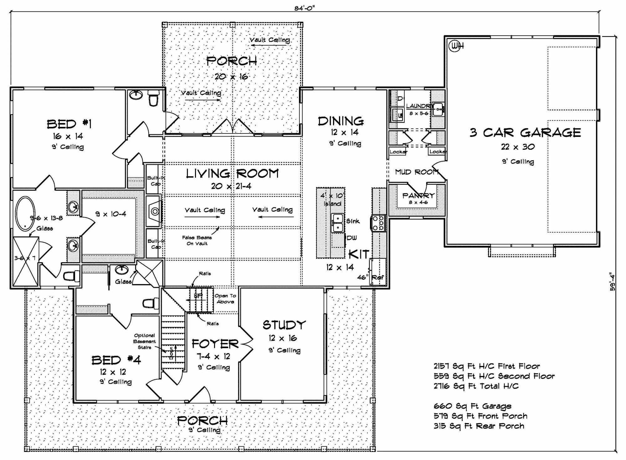 This charming home features a total living area of 2,716 sq ft, with 2,157 sq ft on the first floor and 559 sq ft on the second floor. Enjoy outdoor living with a generous front porch of 579 sq ft and a rear porch of 315 sq ft. The garage, which accommodates three bays, spans 660 sq ft and has a side load. The layout includes 4 bedrooms, 3 bathrooms, and 1 half bathroom, all situated on a sturdy slab foundation with 2x4 wall framing. The roof has a pitch of 8:12, providing an attractive silhouette. With a width of 84 feet and a depth of 61 feet 4 inches, this home stands at a height of 29 feet 3 inches, offering 9-foot ceilings on the first floor and 8-foot ceilings on the second floor.