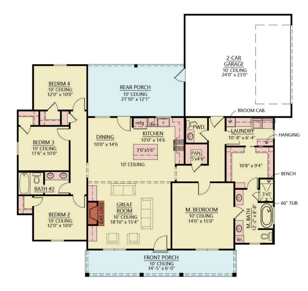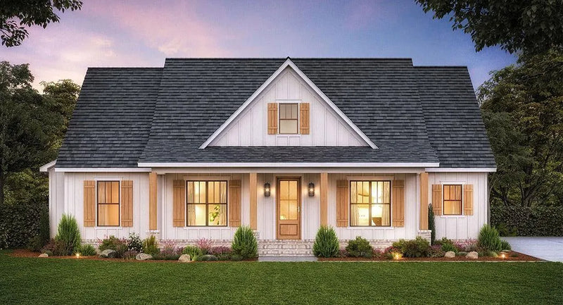 Discover the perfect blend of comfort and style in this charming house plan, featuring a generous total living area of 1880 sq ft on the first floor. With four spacious bedrooms, this home is ideal for families, offering both privacy and togetherness, along with two full bathrooms and an additional half bathroom for convenience. The delightful total porch area of 471 sq ft is perfect for relaxing outdoors or entertaining guests, while the side-load garage, measuring 577 sq ft, accommodates two vehicles and provides easy access to the home. Built on a sturdy slab foundation with 2x4 wall framing, this house is designed for durability and efficiency. The attractive roof features a pitch of 9:12 and 12:12, enhancing the home's aesthetic appeal, and the building height of 26'-9'' coupled with a first-floor ceiling height of 10' creates a spacious, airy feel throughout. With dimensions of 62'-8'' in width and 59'-10'' in depth, this well-proportioned layout maximizes livable space, making this house plan not just a home, but a lifestyle choice. Don’t miss out on the opportunity to make it yours!