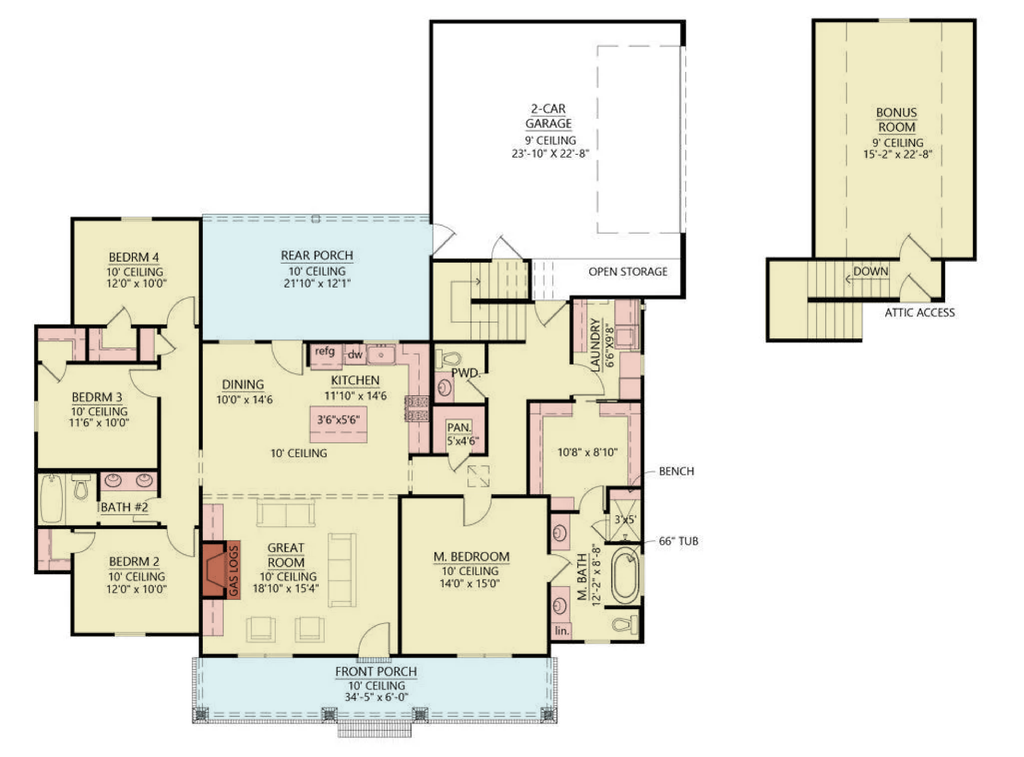 This spacious house plan boasts a total living area of 1985 sq ft, all situated on the first floor, with an additional bonus room of 391 sq ft for extra flexibility. Featuring four comfortable bedrooms, it offers ample space for family and guests, complemented by two full bathrooms and a convenient half bathroom. The home includes a total porch area of 471 sq ft, perfect for enjoying the outdoors. The attached garage, measuring 641 sq ft, accommodates two vehicles with a side load design for easy access. Built on a sturdy slab foundation with 2x4 wall framing, this home is both durable and efficient. The roof features a combination of stick framing with a pitch of 9:12 and 12:12, enhancing its aesthetic appeal. With a building height of 26'-9'' and a first-floor ceiling height of 10', the interior feels open and inviting. The overall dimensions of 62'-8'' in width and 67'-5'' in depth provide a well-proportioned layout.