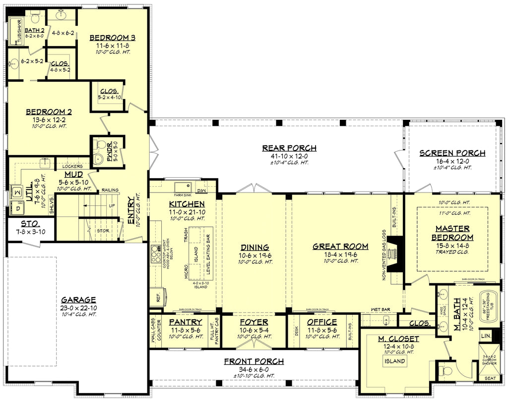 This charming house plan boasts a total living area of 2589 sq ft, designed with three inviting bedrooms and two full bathrooms, alongside a convenient half bathroom. The expansive first floor comprises the entire living space, complemented by a generous bonus room of 794 sq ft, ideal for entertainment or relaxation. Outdoor living is enhanced with a total porch area of 879 sq ft, featuring a welcoming front porch of 207 sq ft and a spacious rear porch of 476 sq ft. The home includes a side-load garage of 566 sq ft with two bays, providing ample storage and parking. Built on a slab/crawl foundation with sturdy 2x4 wall framing, the exterior showcases a classic brick finish. The roof features a stylish combination of 8:12 and 4:12 pitches, adding character to the design. With a width of 81'10'' and a depth of 64'-2'', this home maximizes space and comfort. The first-floor ceiling height of 10' creates an open, airy atmosphere, while the second-floor ceiling height of 9' adds to the overall spaciousness.