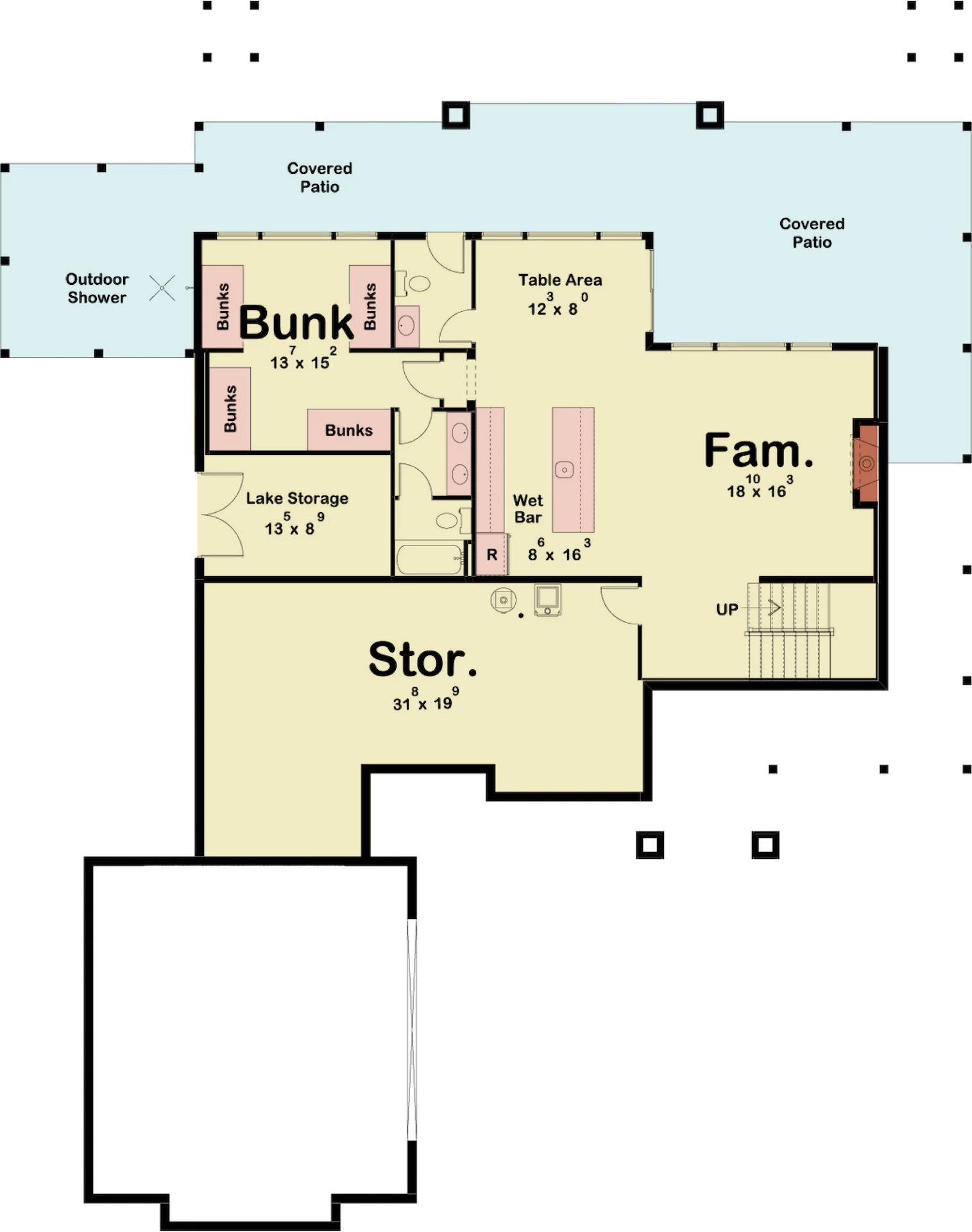 An optional finished walkout basement adds 1032 sq ft and includes a large family room, a table area, a wet bar, and a bunk house with 4 bunks.