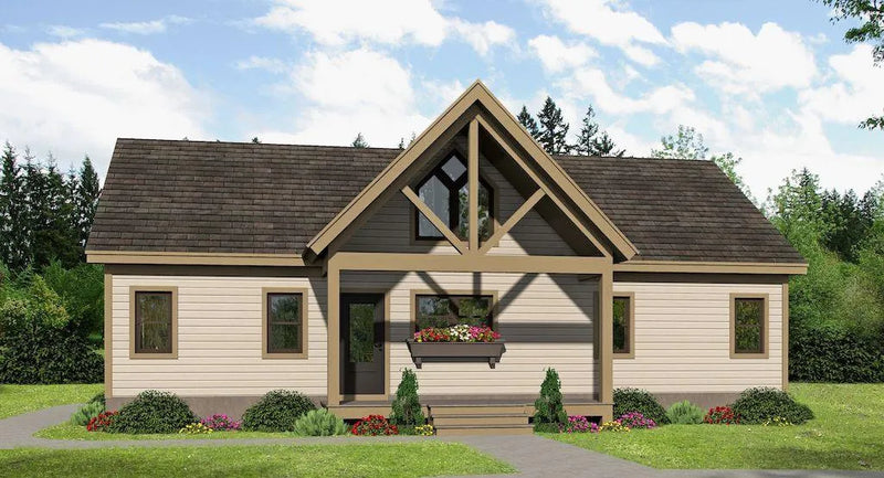 This cozy home plan features a total living area of 1,273 sq ft on the first floor, making it perfect for small families or couples. It includes two comfortable bedrooms and two well-appointed bathrooms for convenience. The design boasts a spacious deck of 368 sq ft, ideal for outdoor relaxation and gatherings. A charming front porch of 106 sq ft welcomes you into the home. With a total area under the roof of 1,830 sq ft, there's ample space for storage and living. Constructed on a crawl or basement foundation, this home provides stability and flexibility. The 2x4 wall framing and stick roof framing ensure a solid structure, while the 8:12 roof pitch adds visual appeal. The building height of 19' and a ceiling height of 9' create an open and airy atmosphere throughout.