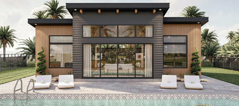 • This modern pool house plan gives you 792 square feet of covered space with a wet bar and lounge. The large glass and wood accents make you want to step inside this pool house.