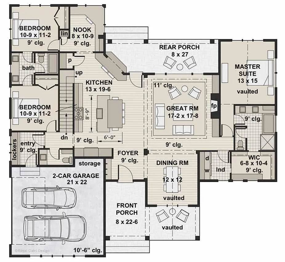 From the inviting covered front porch with a vaulted ceiling and striking columns you'll step into the dining area, also with a vaulted ceiling. The open layout allows it to flow from there into the great room with an elegant 11' ceiling, large fireplace and sliding doors to the expansive covered rear porch.