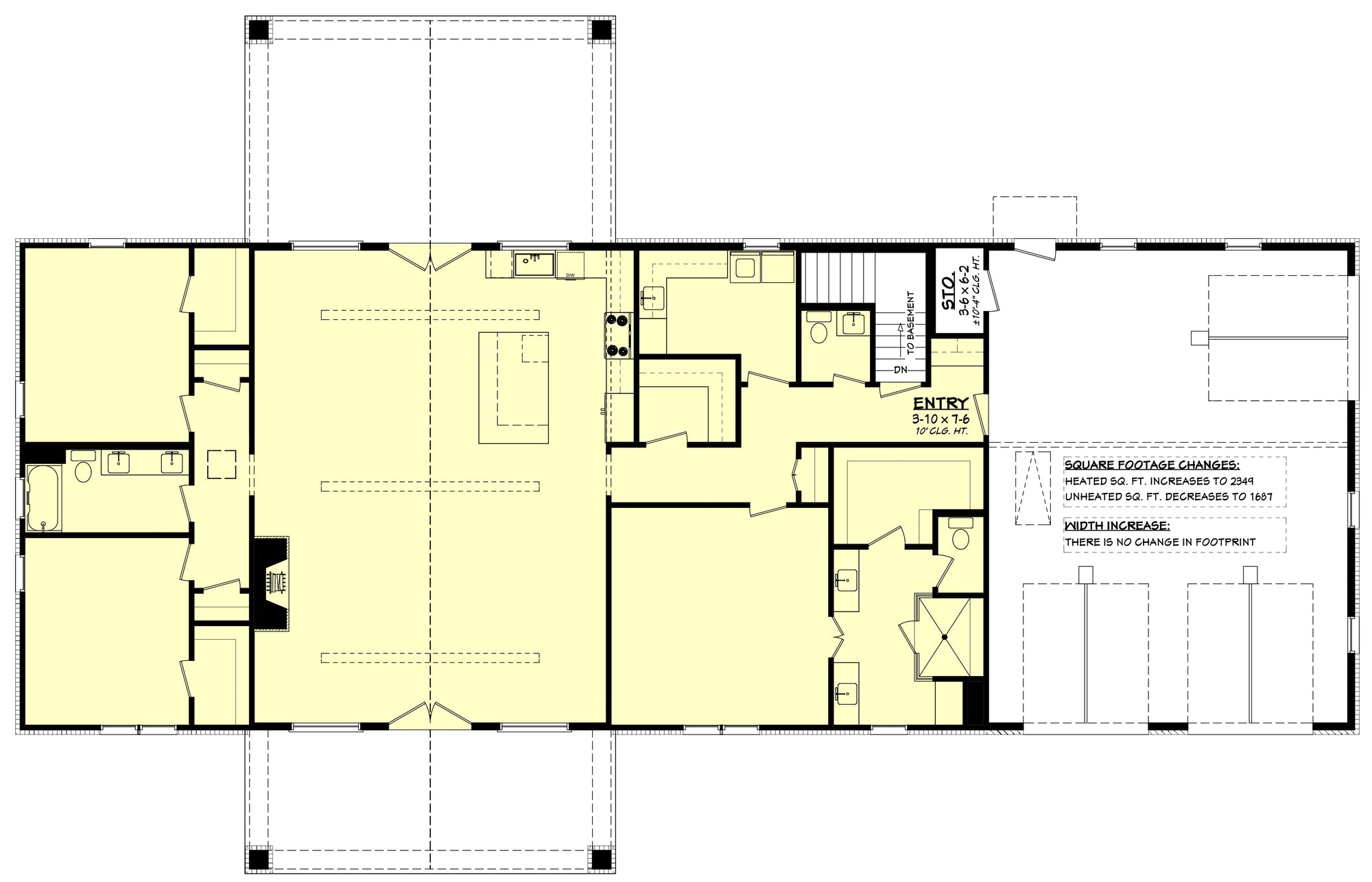 This one-story house plan offers 2,335 square feet of heated living space, combining practical features with thoughtful design. The home includes three bedrooms and two and a half bathrooms, arranged in a split-bedroom layout for privacy and convenience. The master suite, located on the first floor, features a walk-in closet and a private bath, while two additional bedrooms are situated on the opposite side of the home, perfect for family or guests.