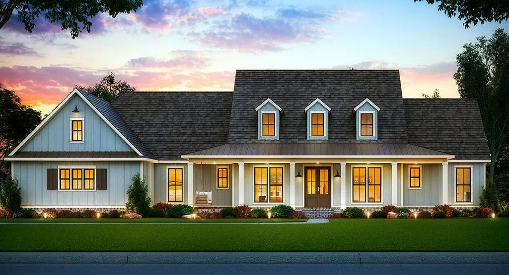 Opulent and spacious flaunting an attractive covered wraparound front porch, the Piney Fluff house plan impresses with its country charm, farmhouse flair and 2705 sq. ft. of total living space. Featuring an impressive five bedrooms, three bathrooms plus one half bathroom and three-car side load garage, this one-story house plan offers grand design in a comfortable environment.