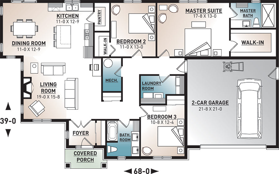 HVAC and plumbing drawings are not included. Your mechanical and plumbing subcontractors will determine the best layout for your site. Local HVAC codes, climatic requirements and commonly used systems vary throughout the country. The direction of how water flow will enter the home vary from case to case. For this reason, it is impossible to provide universal plans.