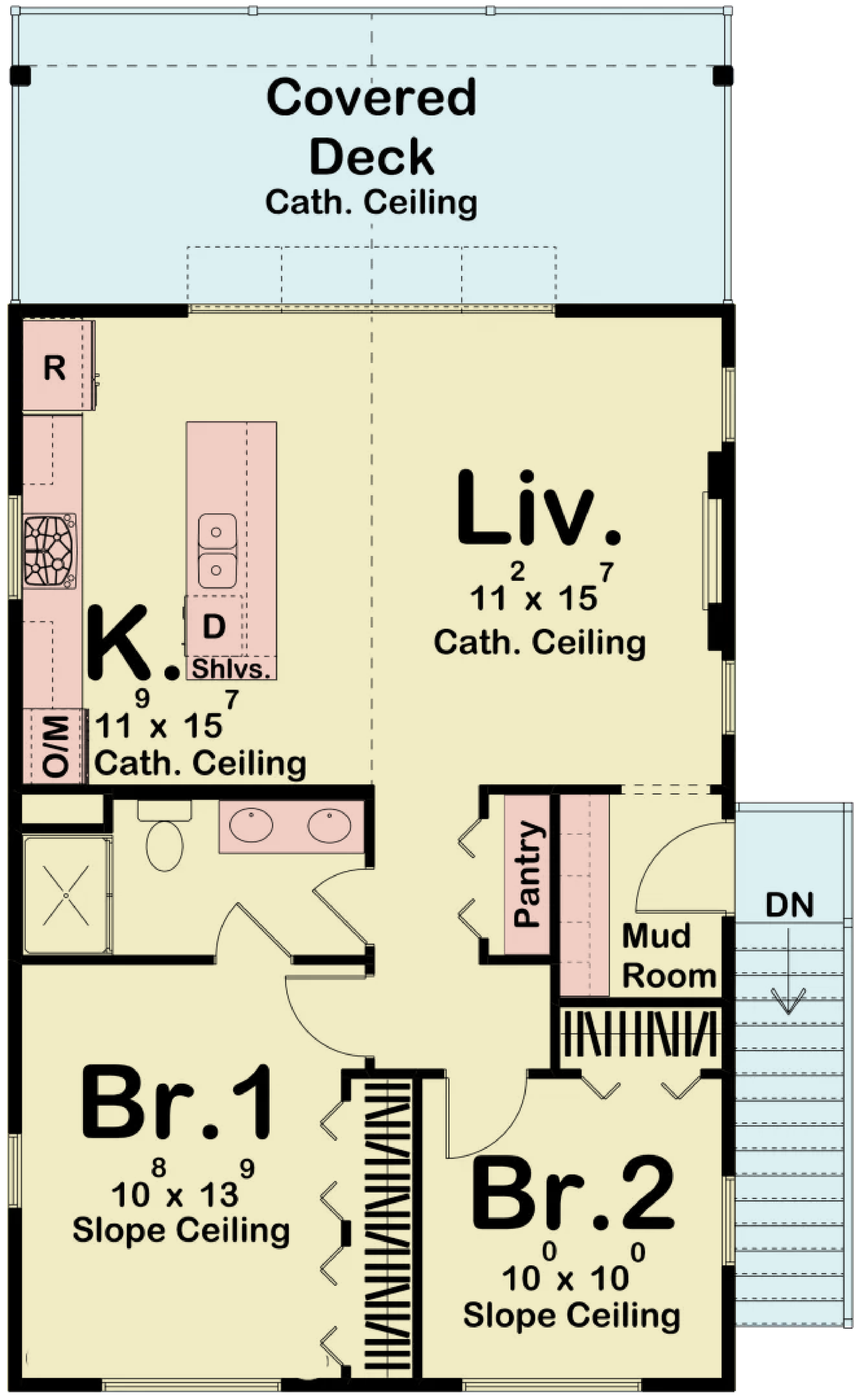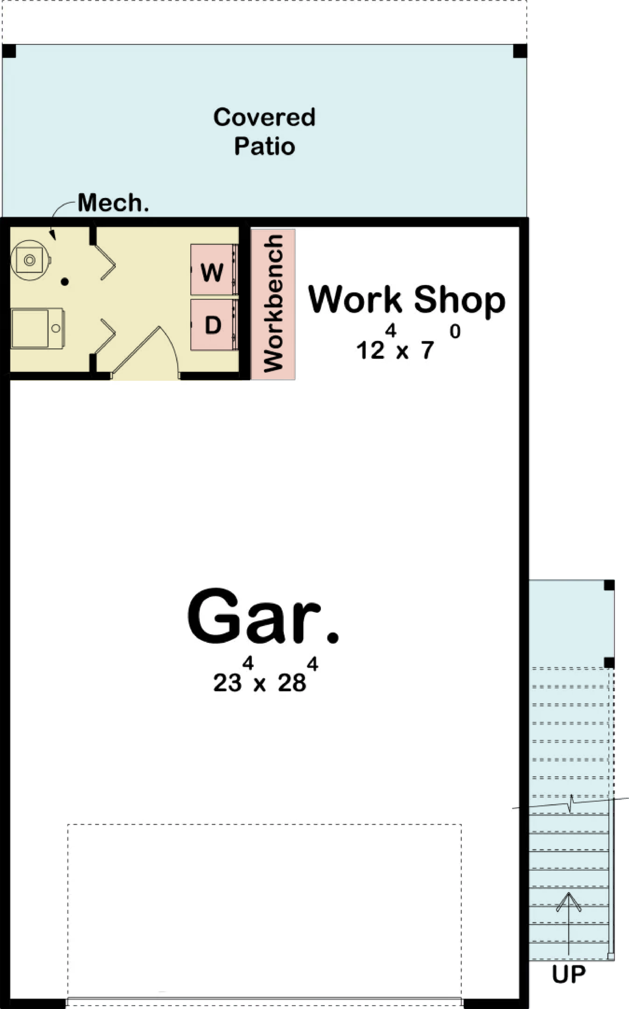 This compact house plan offers a total living area of 915 sq ft, featuring a unique layout with 52 sq ft on the first floor and a spacious second floor of 863 sq ft. Designed for functionality, it includes two bedrooms and one bathroom, making it perfect for small families or couples. The front-loading garage spans 781 sq ft and accommodates two vehicles, enhancing convenience. Built on a slab foundation with 2x4 wall framing, the house measures 28 feet in width and 46 feet in depth. The first floor boasts a ceiling height of 9 feet, while the second floor features an 8-foot ceiling, ensuring a comfortable living environment. This house plan combines efficient use of space with a welcoming design, ideal for modern living.