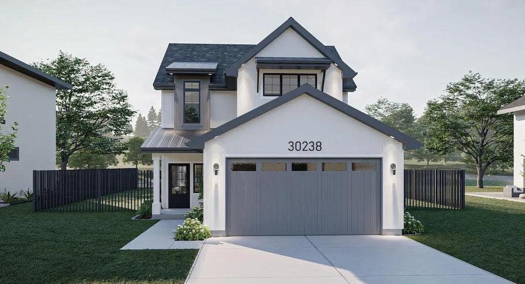 This charming house plan features a total living area of 1,591 sq ft, split between a spacious first floor (749 sq ft) and a second floor (842 sq ft), perfect for families or those needing extra space. The home includes three bedrooms and two bathrooms, with an additional half bathroom for convenience. A front-loaded garage (445 sq ft) accommodates two vehicles, ensuring easy access. Built on a slab foundation with 2x4 wall framing, this home measures 28 feet in width and 52 feet in depth, reaching a height of 28 feet 7 inches. The first-floor ceiling height is 9 feet, providing a roomy feel, while the second floor has a ceiling height of 8 feet. With its efficient layout and cozy design, this house plan is ideal for comfortable living.