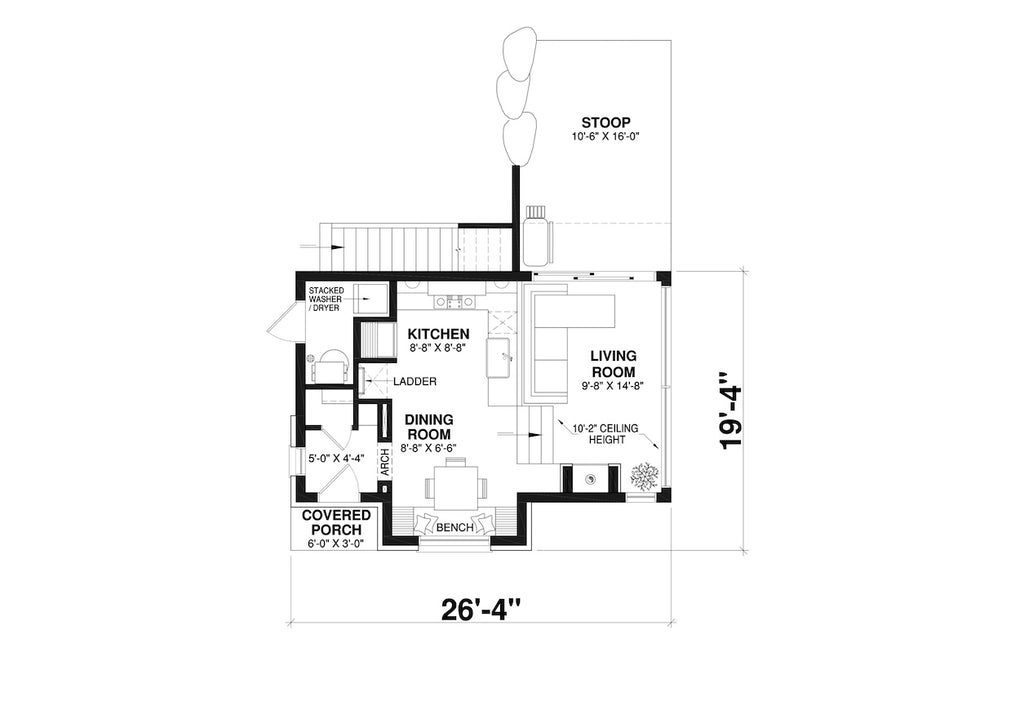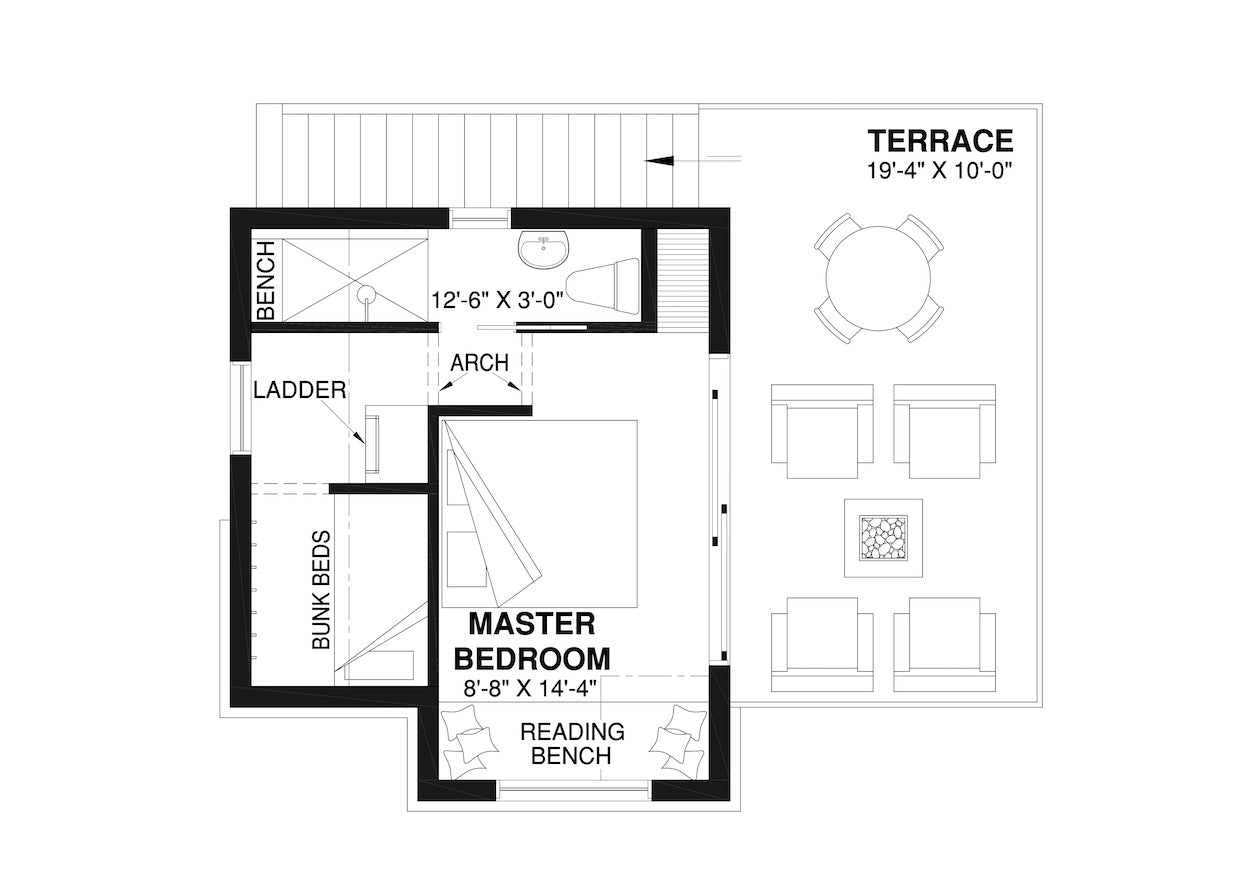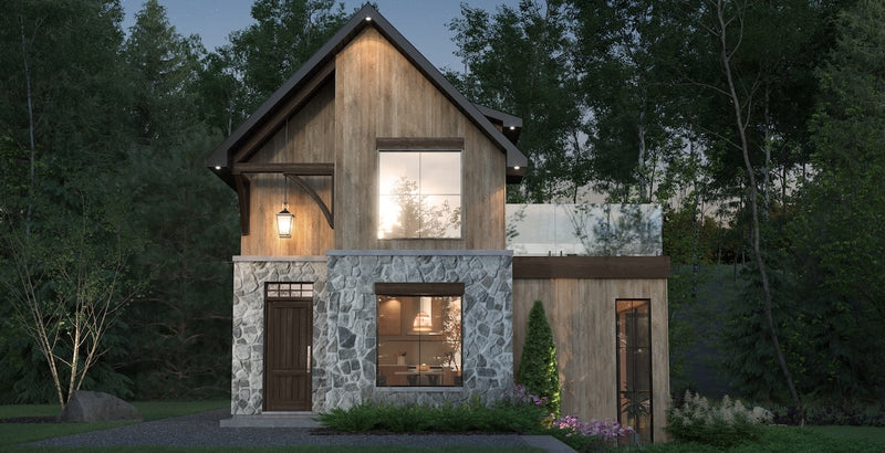 • This compact contemporary cottage makes a great vacation home or rental property. Its stone and wood exterior give it a rustic feel and looks great in almost any setting. Inside, it gives you 741 square feet of heated living with the master suite and bunk room on the second floor.