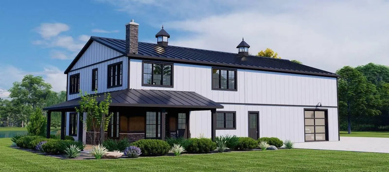 • Board and batten siding mimics the ribbed metal roof on the exterior of this New Ameridcan Barndominium-style house plan (stick-framing).