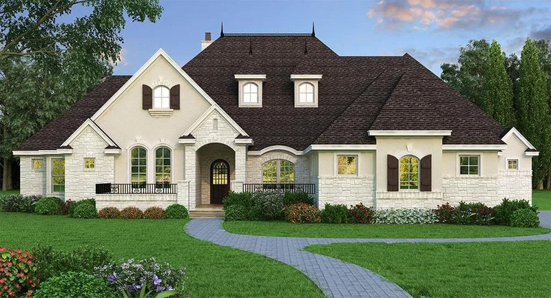 This lovely country home plan offers a taste of European elegance all on one level. The exterior brick and stucco offer peaked roofs, spires, country shutters, arched pane glass windows within the dormers, and a country front porch and courtyard. Under a covered entryway, you are lead to the arched front door beyond wrought iron trimmed railing into the foyer.
