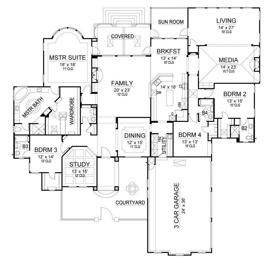 The family room is an open sunlight-filled space with a wall of floor-to-ceiling windows that blur the lines between indoors and out with a warming fireplace and built-ins. At the left rear of the home plan is the luxurious master suite boasting curved windows in the seating area, a trey ceiling and luxurious master bath with his and hers vanities, a marble and tile corner Jett tub, separate shower, and a large wardrobe with built-ins. A door from the master suite leads to the covered patio. From the covered patio, enter the bright sunroom with access to the formal living room. A wall of windows in the living room offers a bright view of the landscaped backyard. Off the living room is the vaulted media room with a fireplace and storage closet. Two family bedrooms, each with bathrooms and walk-in closets and a three-car, side entry garage with workspace and entry into the utility room, complete this luxury country ranch home plan.