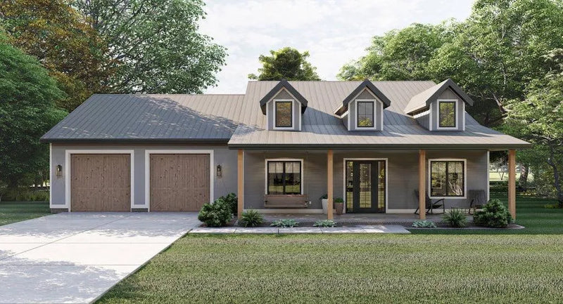 The Rolling Hills plan is a beautiful Barndominium style house plan. A trio of dormers and a large front covered porch invite guests into the home. Immediately inside the home, you'll find a practical home office that is perfect for working from home.