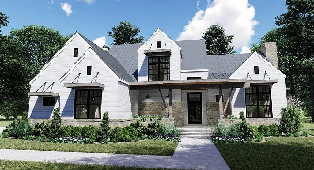 The Rolling Wood Hills farmhouse house plan beautifully combines contemporary architecture with the warmth of a cozy farmhouse. This 2800 sf. two-story house plan boasts an impressive open floor plan layout with vaulted ceilings and stunning views.