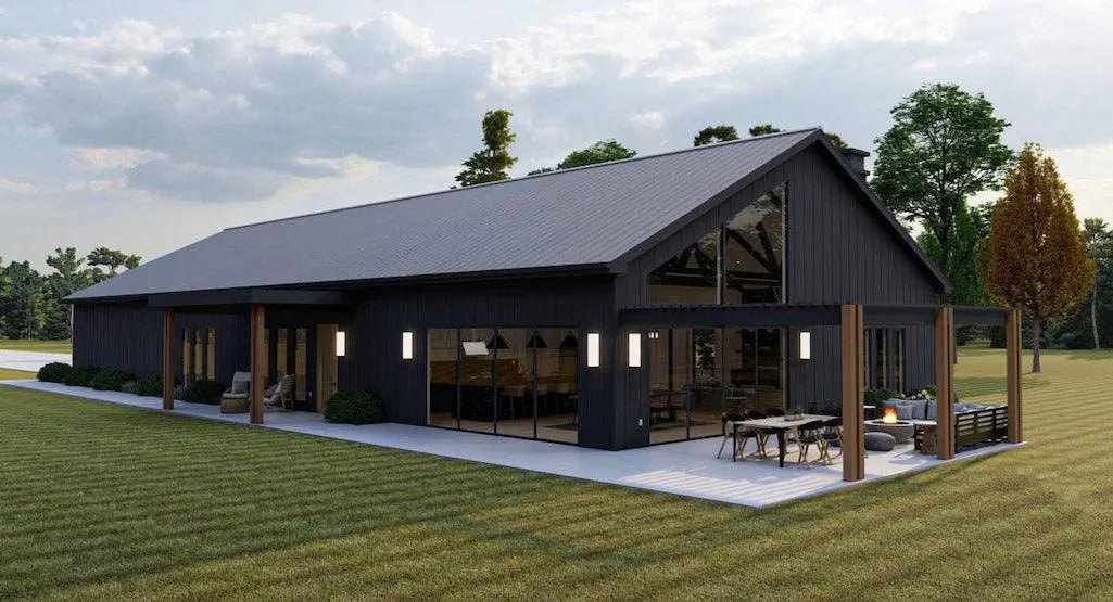 The Round Rock plan is a beautiful Modern Farmhouse Barndominium. The exterior of the home is highlighted by dark board and batten siding, a standing seam metal roof, and a large pergola.