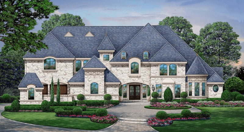The interior of this luxury chateau inspired house plan design is just as majestic as the exterior. The grand foyer of the Royal Birkdale house plan opens to a two-story living room featuring a see-through fireplace and magnificent views of the pool/spa area. Dining in the columned framed dining room of this majestic Texas Style Chateau house plan will be a memorable experience with views and access to the elegant courtyard. The private master wing surprises with a separate fitness area and elegant private bath. The gleaming heart of the Royal Birkdale chateau home plan features a beautiful light-filled state-of-the-art kitchen and family room. Visit the private study ideal for the avid reader. A small library can be enjoyed above the study via a small spiral staircase. The second level of this estate house plan showcase three secondary bedrooms and an ample game room with views living room and foyer below.