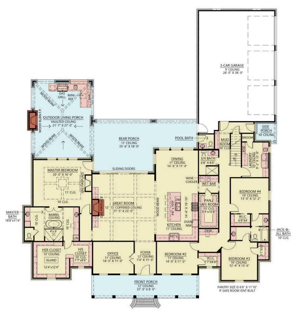 This impressive home boasts a total living area of 3585 sq ft, all on the first floor, complemented by a bonus room of 779 sq ft. The design includes expansive porches totaling 1478 sq ft, perfect for enjoying the outdoors. The total area under the roof reaches 6947 sq ft, providing ample space for comfortable living. The side-loading garage offers 1105 sq ft and accommodates three vehicles. This residence features four bedrooms, three bathrooms, and one half bathroom, all built on a slab foundation with 2x4 wall framing. With a width of 87 feet 8 inches and a depth of 99 feet 11 inches, the home stands at a height of 34 feet 2.5 inches. Inside, the first-floor ceiling height is 10 feet, while the garage ceiling height is 9 feet, ensuring an open and airy atmosphere throughout.
