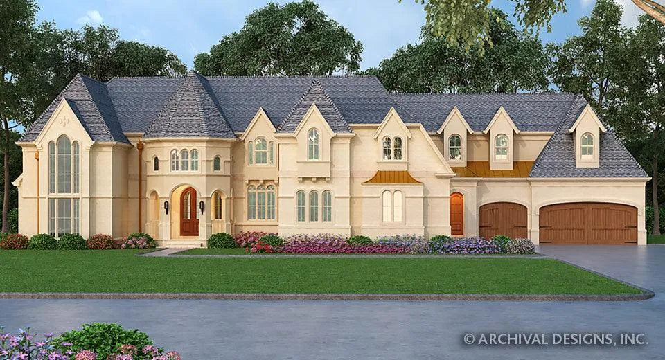 The beautifully Saint Augustine luxury house plan welcomes all guests. Think about the prestige of an affluent home adorned by European and French inspired roof lines, arched windows, and spectacular two-story windows. This estate offers timeless old-world charm and modern amenities.
