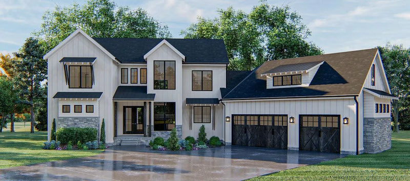 The Savannah Falls plan is a Modern Farmhouse masterpiece. The exterior of this home combines board and batten siding, metal roofing, and stone to give this home the timeless modern farmhouse look. The large angled 3 car garage with storage provides a great place to store your cars and your toys. Once you walk in through the covered porch, you'll find yourself in a grand 2 story entry. The great room is warmed by a fireplace and lets in tons of natural light through the large windows that look out to the covered patio. This home has a wonderful kitchen that includes a massive walk-in pantry and a large island with a snack bar.