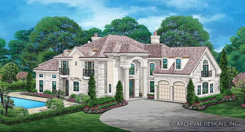 Upstairs, two family bedrooms, each with walk-in closets, trey ceilings and private Juliet balconies, share a Jack-n-Jill bathroom with his and hers vanities. A game and media room share space with a powder room and bonus room with full bath. Awesome views to the first floor plan complete this elegant luxury European-style home plan.