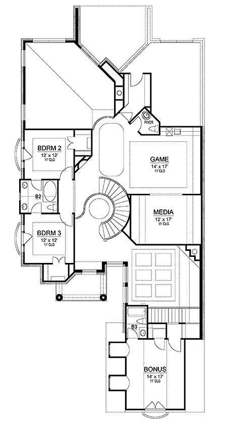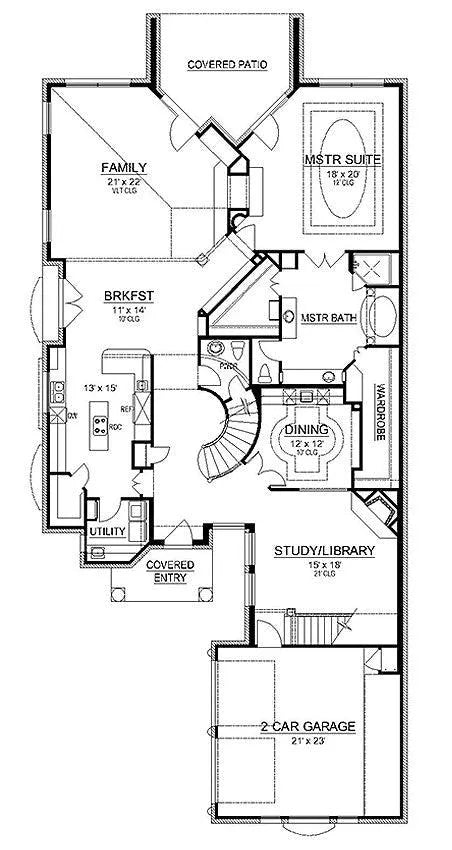 As you enter the stunning foyer of this stunning narrow house plan, you immediately have a view of the overwhelming ceiling styles that lead into the family living center, which includes the family room, study/library, dining, kitchen and breakfast room. A dramatic curved stairway leads to the second floor plan inside the foyer. Through double French doors, enter the elegant dining room offering a trey ceiling and built-ins. Completing the first floor plan is the master suite with a step trey ceiling and luxurious master bath with his and hers vanities, a separate glass shower, marble step-up tub, and large wardrobe with built-ins. A powder room that sits under the curved staircase in the foyer, completes this level of this European-style luxury house plan.