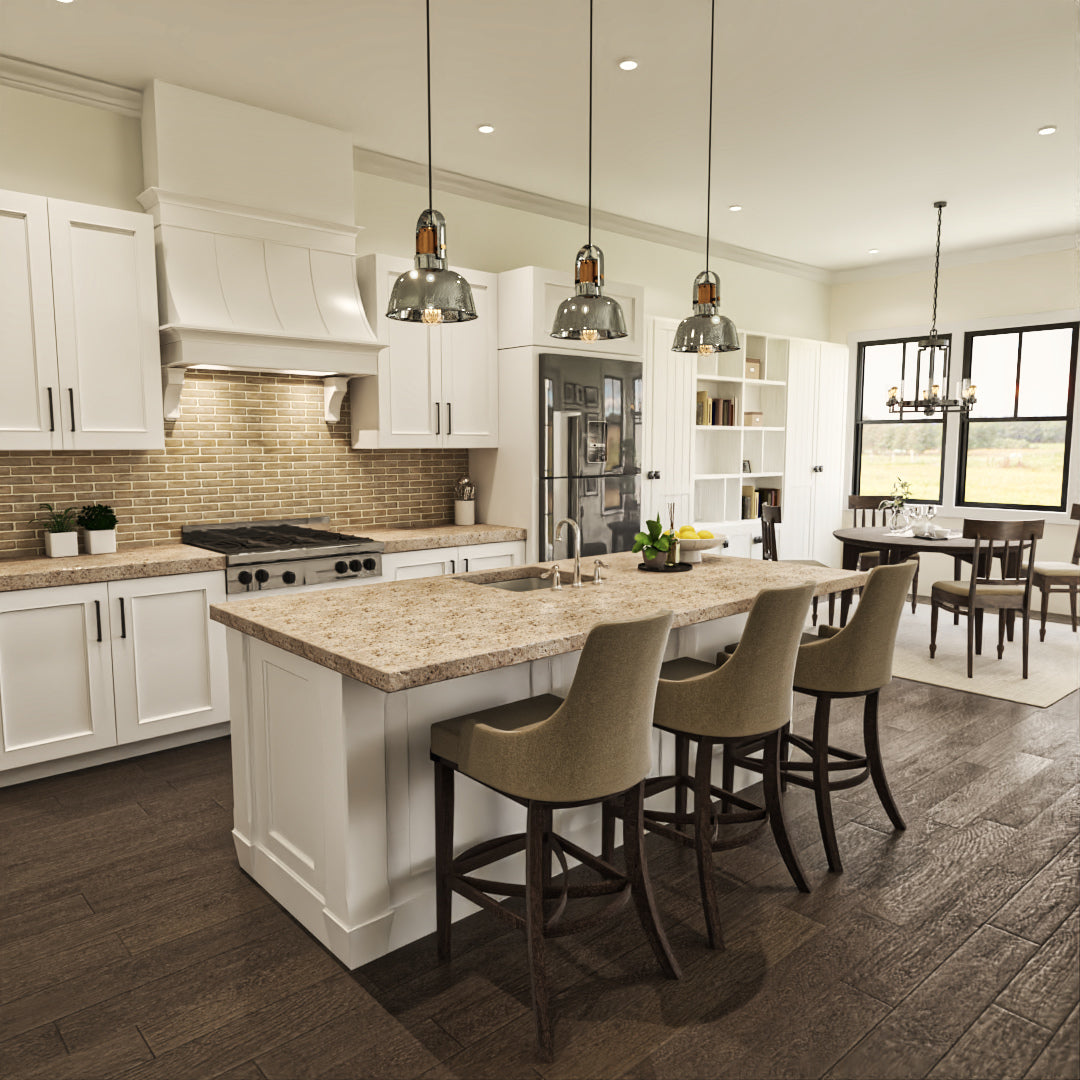 This 3-bedroom, 2.5-bath home offers 1,925 sq ft of spacious, single-level living. The first-floor master suite includes a walk-in closet and a luxurious bath, offering a private retreat. The open-concept kitchen features a central island and walk-in pantry, flowing seamlessly into the breakfast area and living space with vaulted ceilings that create an airy, expansive atmosphere.