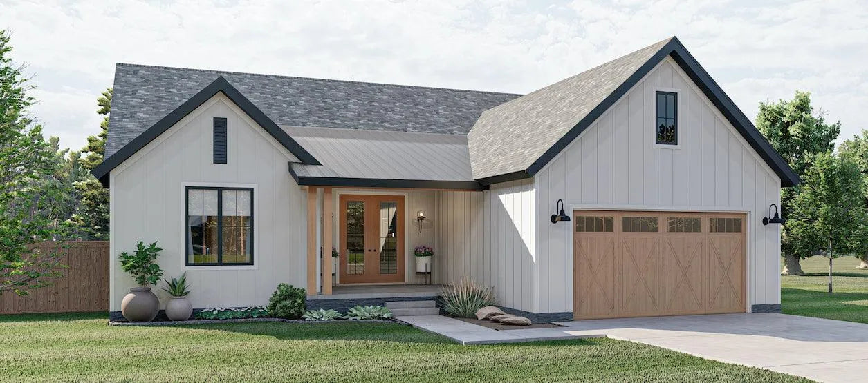 The Skidmore Farm is an affordable, beautiful Modern Farmhouseplan. The exterior showcases white board and batten siding, a wood garage door, and a metal roof over the front porch.