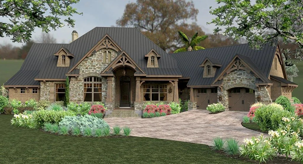 Rough sawn trusses, tapered columns and bracket details are just a few of the exquisite details of this wonderful ranch house plan.