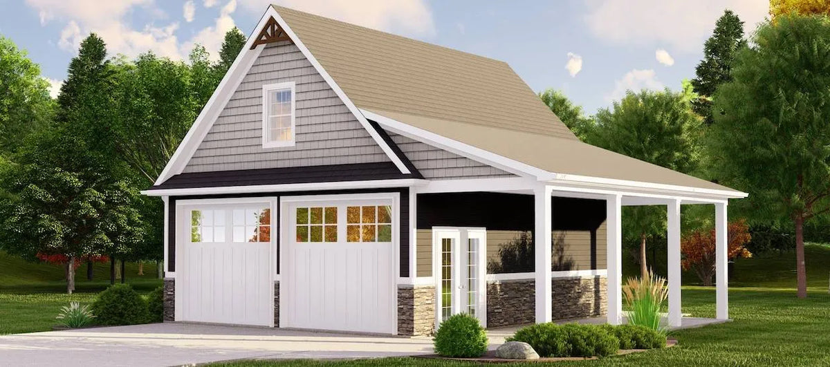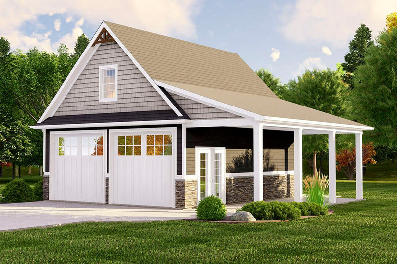 This detached garage plan gives you 721 square feet of parking behind its matching 10' by 9' overhead doors. A shed roof on the right gives you a covered porch that runs the full depth of the garage. A man door on the back wall gets you to the back yard. A half bath is located in the back of the garage as well as stairs. A 343 square foot bonus room above the garage can be put to many uses.