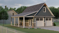 This detached garage plan gives you 721 square feet of parking behind its matching 10' by 9' overhead doors. A shed roof on the right gives you a covered porch that runs the full depth of the garage. A man door on the back wall gets you to the back yard. A half bath is located in the back of the garage as well as stairs. A 343 square foot bonus room above the garage can be put to many uses.