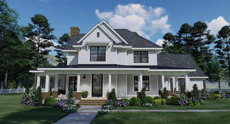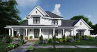 The charming Spring Creek Farm house plan boasts a huge wraparound front porch and unique two-story floor plan layout you won't find anywhere else. This magnificent country house plan welcomes you into a two-story family entertainment room with views into the chef's kitchen.