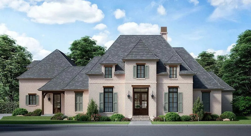 Graceful brickwork and a grand European/French style influence this exquisite two-story Squire Creek house plan. This luxury home comes with 3750 sq. ft of total living space, four bedrooms, three bathrooms plus one half bathroom. Wooden shuttered windows elegantly contrast with the brickwork, further reflected in the steps leading up towards the opulent front entrance.