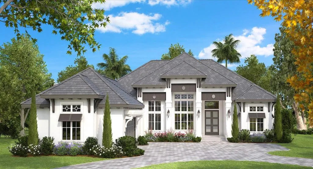 This single story island-inspired West Indies house plan provides just over 4,000 square feet of living space with four bedrooms, four full baths, one pool bath, formal living and dining areas and a handsome study. Enjoying the tropical weather is easy with the thoughtfully designed outdoor living areas featured in this pool home plan. A vaulted ceiling in a tongue and groove finish and a built-in fire pit along with space for multiple seating arrangements create a welcoming space for entertaining friends and family. Ample use of glass also brings in spectacular rear-oriented coastal, waterfront or beach home views. Split bedrooms, volume ceilings and lots of storage space make the St. Lucia Model a house plan not to be missed!