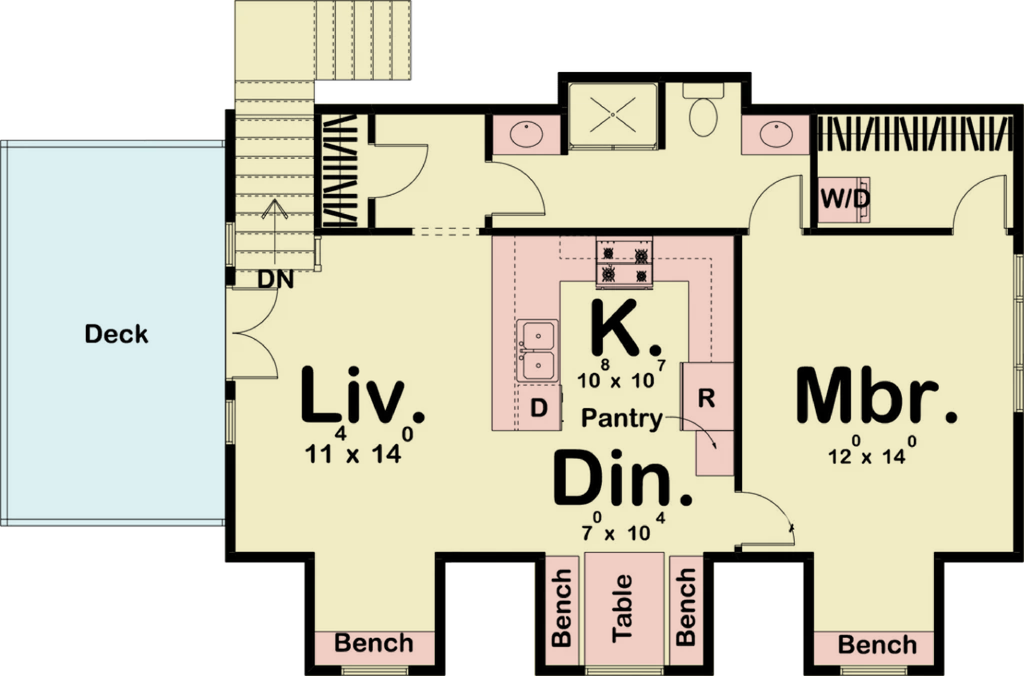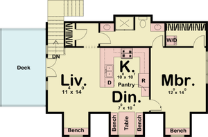 In the upstairs living area, you will find an efficient open floor plan that includes a u-shaped kitchen with a breakfast bar. Just off the kitchen is a wonderful built-in table with benches in the dining area. The master suite includes access to the bathroom and a built-in window bench.