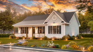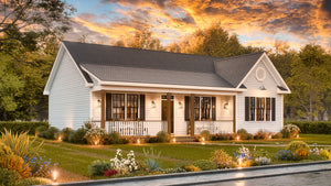 The exterior welcomes you with a 150 sq ft covered front porch and a 100 sq ft rear deck, perfect for relaxing mornings or casual gatherings. Inside, a cozy keeping/family room serves as the heart of the home, providing a warm space to unwind. A 9-foot ceiling height throughout the first floor adds to the home's spacious feel, while the 8:12 pitched roof and stick-framed construction ensure structural integrity with a classic profile. Whether you're starting out, downsizing, or simply looking for a functional and beautiful single-level home, this plan delivers thoughtful living with charm and efficiency.