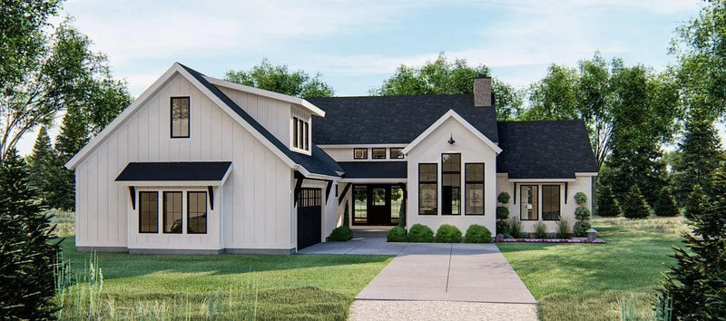 The Statesboro is an amazing Modern Farmhouse style plan. The exterior screams modern farmhouse with its board and batten siding and large windows. Inside the home, you'll find this plan is packed with some amazing amenities. The large family room lies under a soaring cathedral ceiling and is warmed by a fireplace that is flanked by a built-in bookshelf. The dining room and kitchen flow seamlessly with the family room in this great open concept. The kitchen includes a large island and a walk-in pantry. A wonderful office lies just off the family room and is perfect for anyone who works from home.