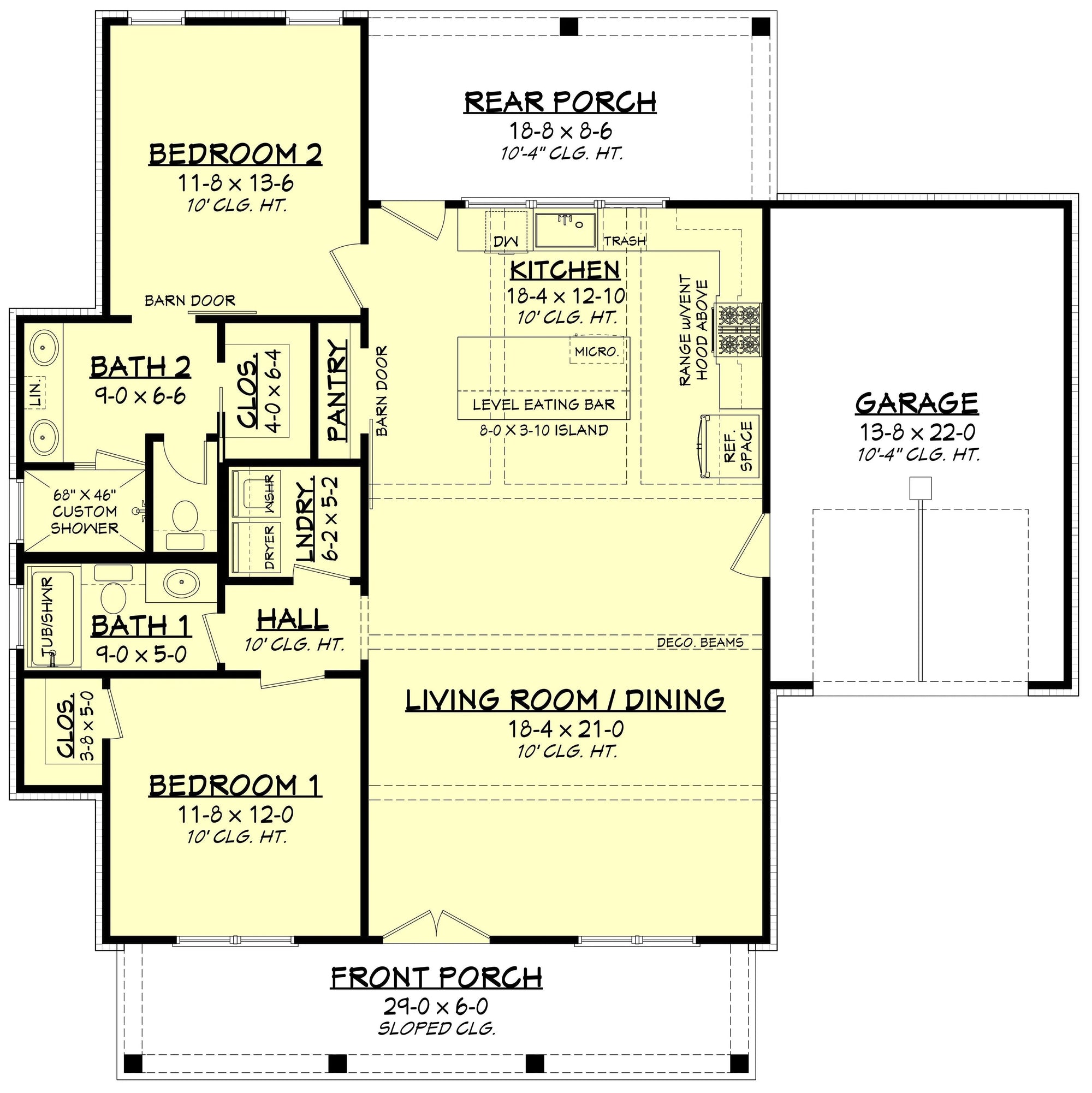 This cozy house plan encompasses 1,263 sq ft of heated living area, thoughtfully designed for comfort and functionality. The spacious first floor features two bedrooms and two bathrooms, making it ideal for small families or couples. Outdoor living is enhanced with a front porch measuring 174 sq ft and a rear porch of 159 sq ft, totaling 333 sq ft of space perfect for relaxing or entertaining. The home also includes a front-load garage that accommodates one vehicle, built on a slab or crawl foundation with durable 2x4 wall framing.