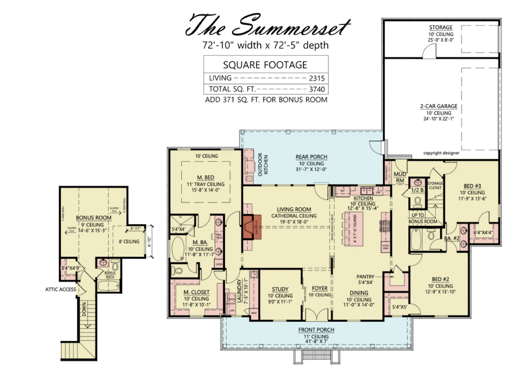 Explore this impressive 2,315 sq ft home, designed for both comfort and style. The first floor features an expansive layout with 10' ceilings, providing an open and airy atmosphere. A bonus room adds versatility, perfect for a home office, playroom, or entertainment space, spanning an additional 371 sq ft. Enjoy the outdoors with a front porch of 262 sq ft and a rear porch of 374 sq ft, ideal for relaxation and gatherings. The side-loading garage accommodates two vehicles, offering 789 sq ft of space for storage and convenience. Built on a solid slab foundation, this home features a striking design with a roof pitch of 9:12, enhancing its architectural appeal. With a width of 72'10'' and a depth of 72'9'', this residence makes a bold statement. The combination of three bedrooms and two bathrooms ensures ample space for family living. Experience modern living at its finest in this beautifully crafted home!