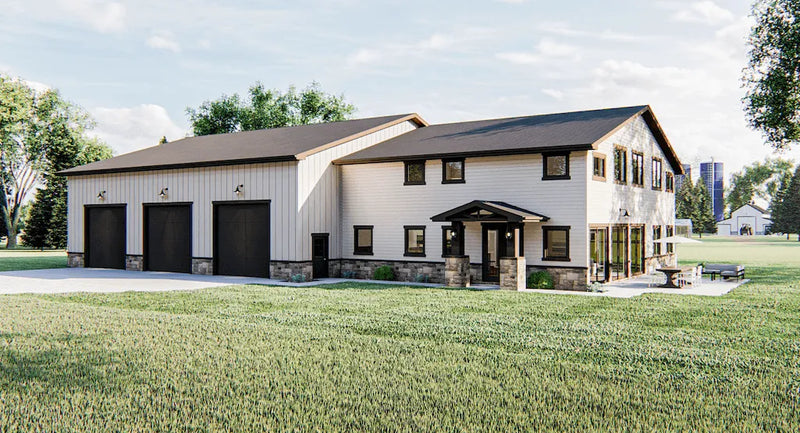 Discover this versatile 2,776 sq ft home plan, featuring a generous four-bay garage and designed for modern living. The first floor offers an expansive 2,025 sq ft layout, perfect for family gatherings and entertaining, while the second floor adds an additional 751 sq ft of living space. With four comfortable bedrooms and three bathrooms, this home provides ample room for everyone. The rear-load garage, measuring an impressive 3,570 sq ft, ensures easy access and plenty of storage for vehicles and equipment. Constructed with a durable post-frame design, this home promises longevity and structural integrity. Enjoy the 9-foot ceilings on the first floor and 8-foot ceilings on the second floor, enhancing the sense of space and openness. Measuring 100 feet wide and 60 feet deep, this plan offers a perfect blend of functionality and style, making it an ideal choice for any family.