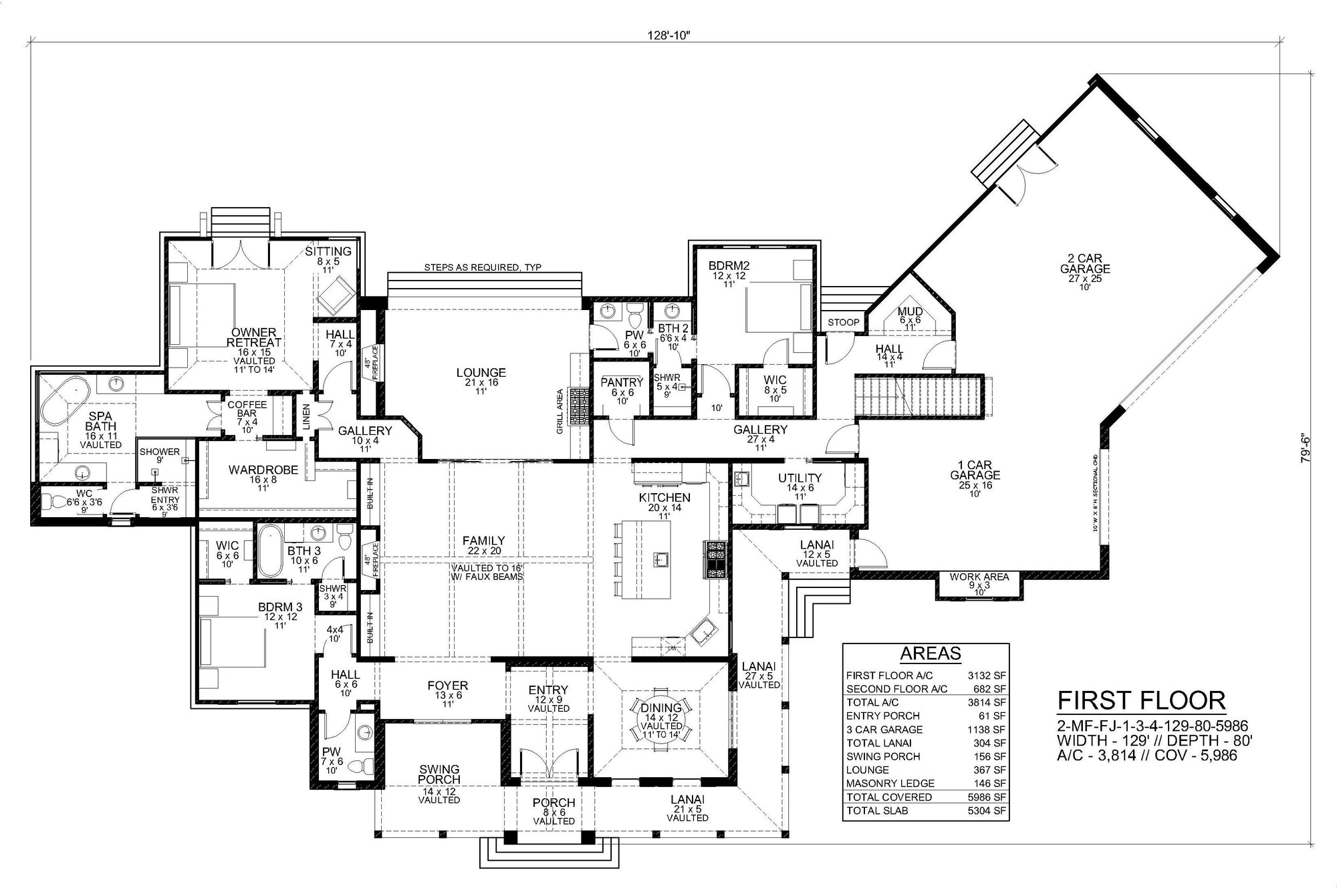 With a front-load 3-car garage (1,138 sq. ft.), 12:12 and 3:12 roof pitches, and 11' first-floor and 8' second-floor ceiling heights, this home is both elegant and practical. Measuring 128'10'' wide by 79'6'' deep, this thoughtfully designed home blends indoor luxury with exceptional outdoor living.