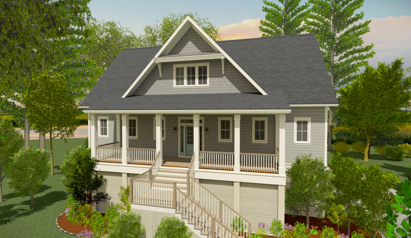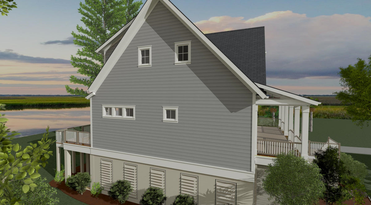 Upstairs, enjoy an open deck perfect for waterfront views and a loft with a beverage bar, offering a relaxed space for gatherings. Built with 2x6 exterior walls and a pier foundation (with optional piling), this home is designed for durability and style. The attached drive-under garage (1,978 sq. ft.) with side entry provides space for 2 cars. With a 12:12 primary roof pitch and 6:12 secondary pitch, the home maintains a timeless aesthetic that complements its scenic surroundings.
