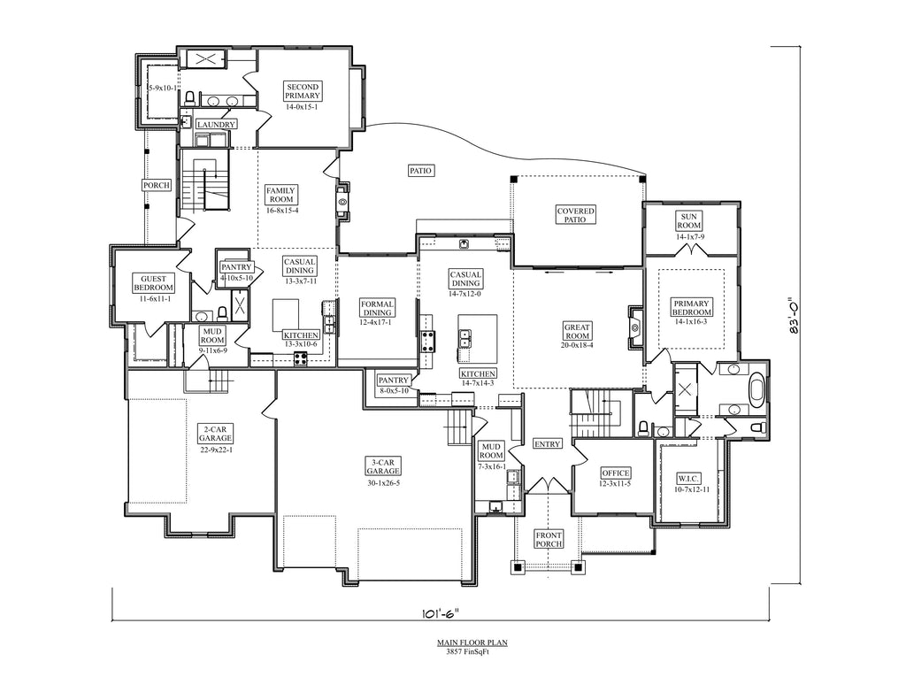 Built on a daylight basement foundation, this home has a 10' first-floor ceiling height and a 9' basement ceiling height. The roof pitch is 10:12 and 12:12, and the home measures 101'6'' wide by 83'0'' deep. The 5-car garage (1,438 sq. ft.) has both side and front entry for convenience.
