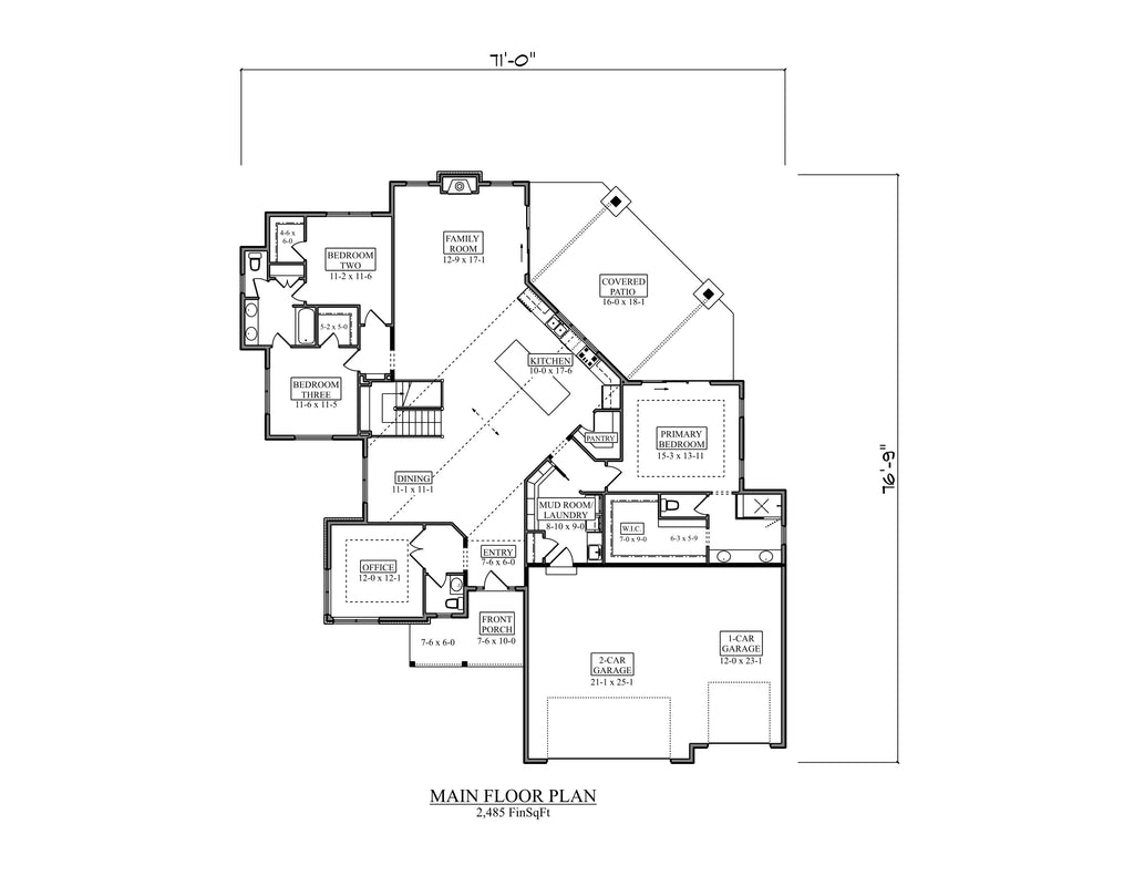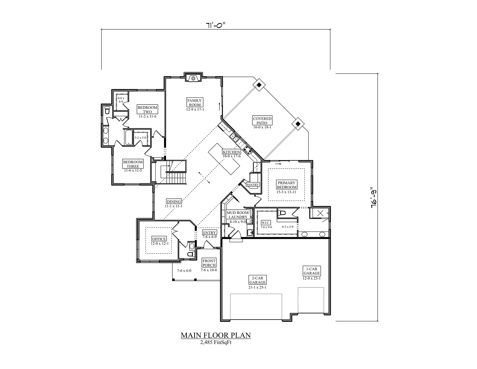 This 2,485 sq. ft. luxury ranch house plan with split bedrooms and a high-ceiling basement is designed for homeowners who crave refined single-level living paired with the architectural drama of steep 8:12 rooflines, sweeping faΓ§ade width, and richly detailed indoorβoutdoor spaces. The homeβs 71-foot width and deep covered front porch establish a welcoming presence, balancing contemporary proportions with the grounded warmth of traditional ranch architecture. Stepping inside, 9-foot ceilings, long sightlines, and light-filled living spaces create an atmosphere that feels spacious yet intimately connected. The open floor plan places the great room, keeping/family room, and formal dining room in a harmonious sequence, allowing gatherings to flow naturally from one space to the next. A central fireplace lends warmth and presence, anchoring the main living area with a soft glow. The gourmet kitchenβcomplete with a large island, eating bar, and walk-in pantryβis positioned for both casual dining and elevated entertaining. Its adjacency to the breakfast area and easy access to the covered patio make it perfect for morning rituals, weekend brunches, and breezy evening meals outdoors. The home office/study provides a quiet retreat for focused work, while the mud room and first-floor laundry with garage access enhance everyday functionality. These elements naturally integrate SEO-rich long-tail keywords such as luxury ranch home with walk-in pantry, open-concept single-story house plan with home office, and ranch floor plan with large kitchen island and great room.