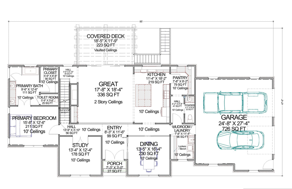 A complete set of working drawings delivered in digital PDF format. This option comes with a license to build ONE home and includes a copyright release for printing unlimited sets of plans and making modifications.