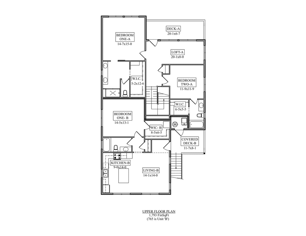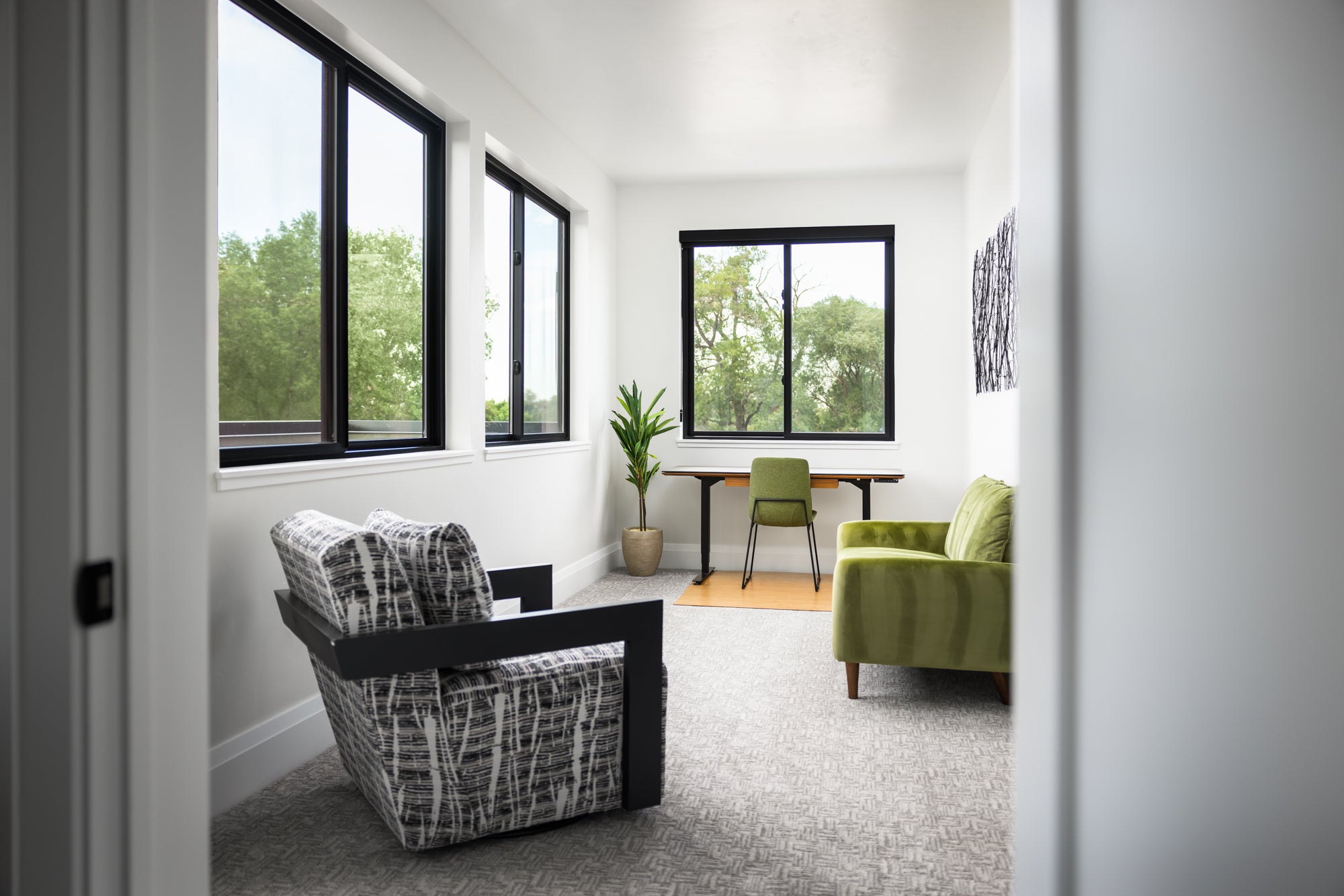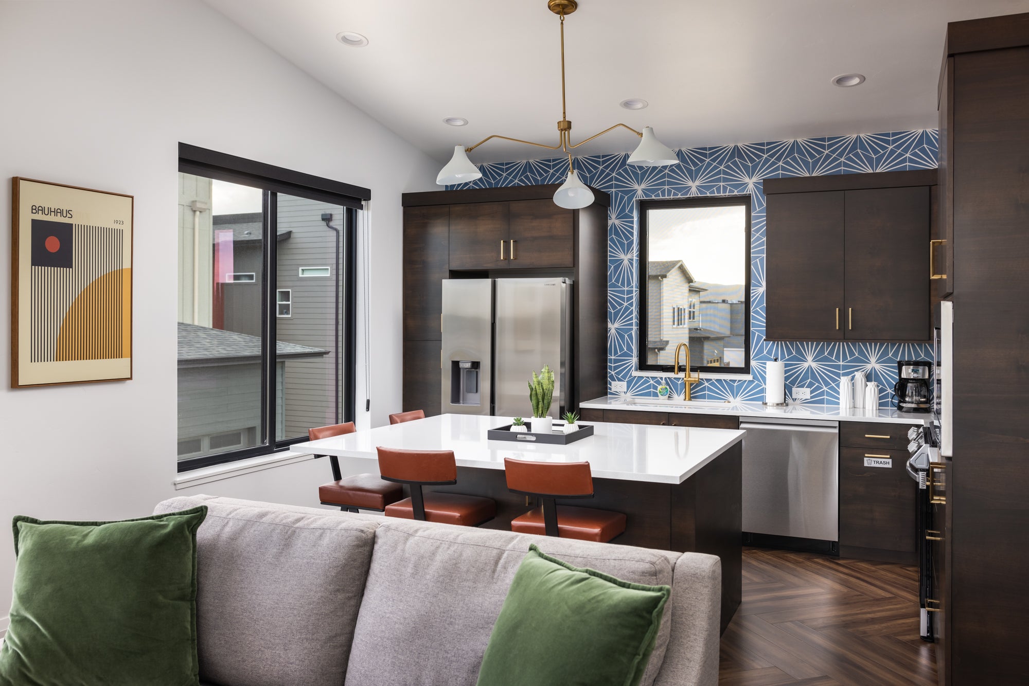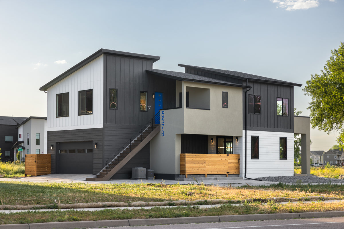 The first unit is a cozy yet efficient space, with a small open-concept living area, a kitchen, and a bedroom that opens to a private covered deck.