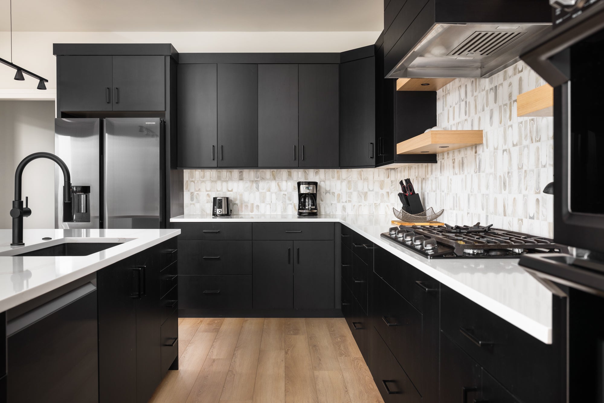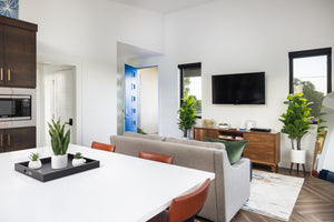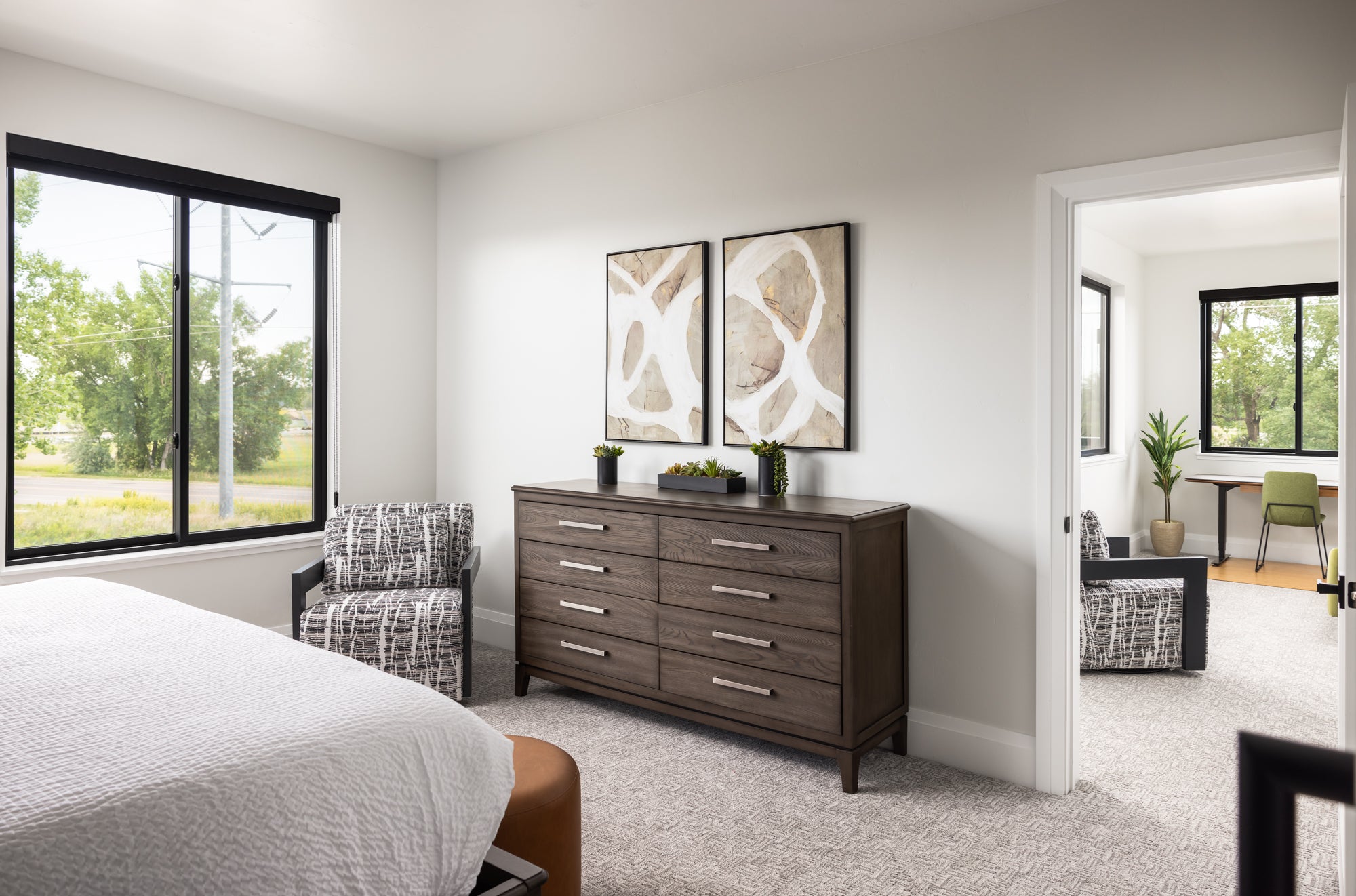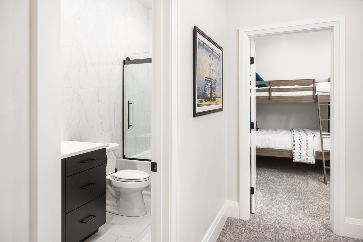 The first unit is a cozy yet efficient space, with a small open-concept living area, a kitchen, and a bedroom that opens to a private covered deck.